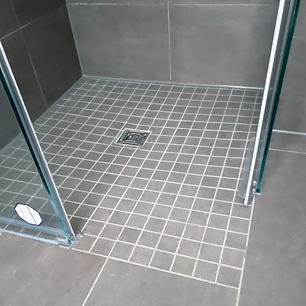Die bodengleich gefliesten Duschböden mit punktuellem Bodenablauf und einem entsprechenden Fliesengefälle zieren (in diesem Beispiel der Musterwohnung) Mittelmosaikfliesen.